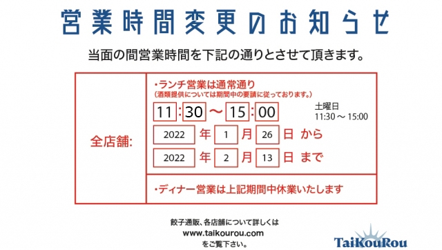 なお、1/21(金)~1/25(火)のディナーは下記の通り時短営業と致します。