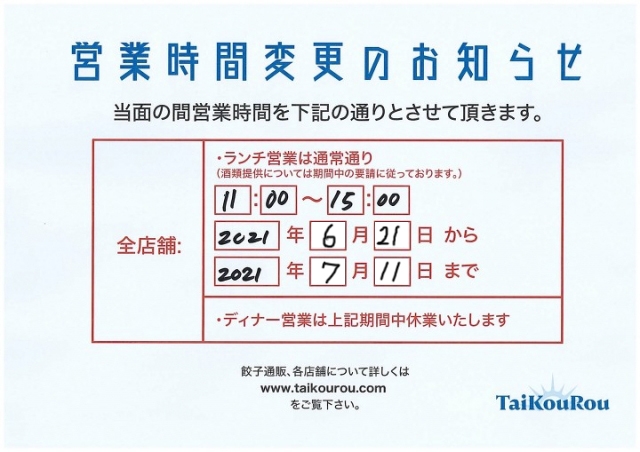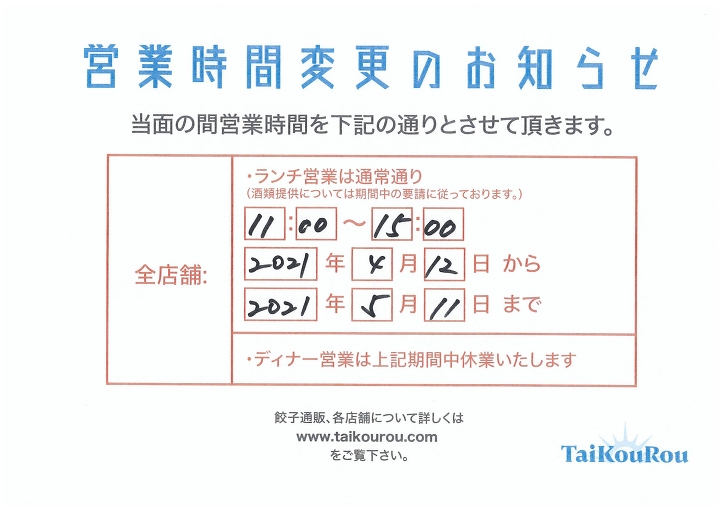 緊急事態宣言延長の為、営業は全店舗ランチ営業のみとさせていただきます。