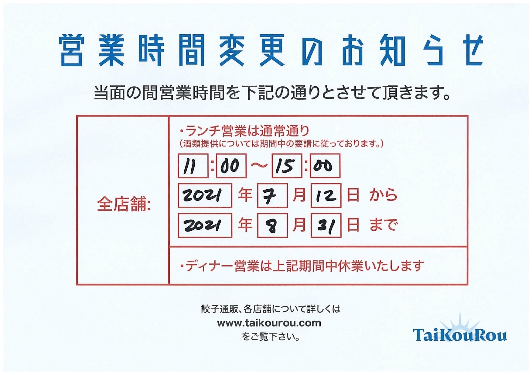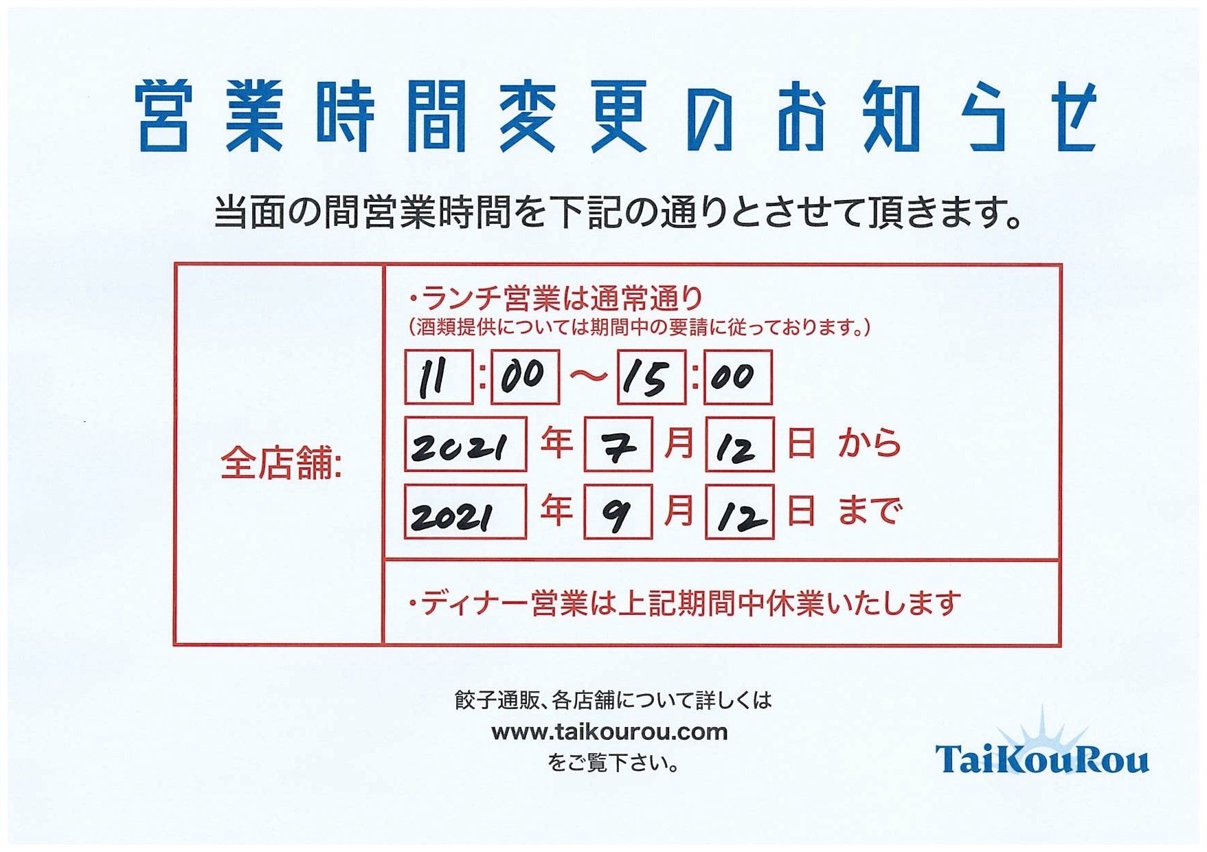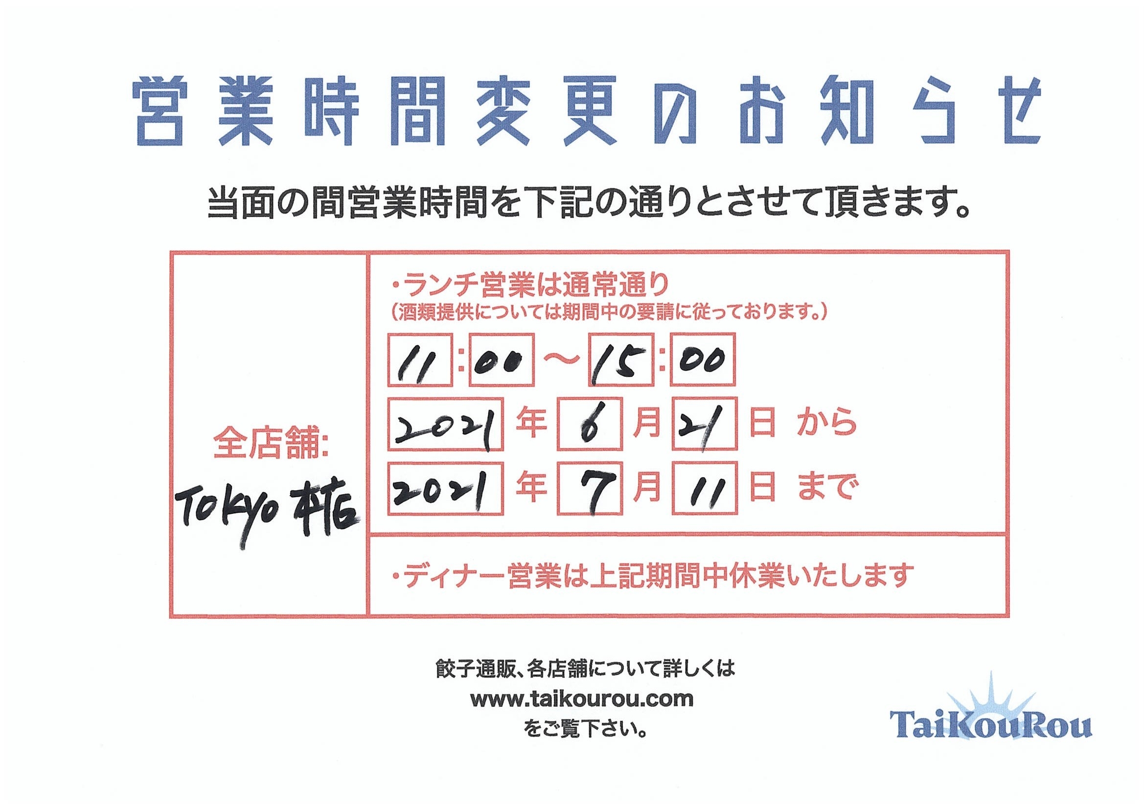 緊急事態宣言延長の為、営業は全店舗ランチ営業のみとさせていただきます。