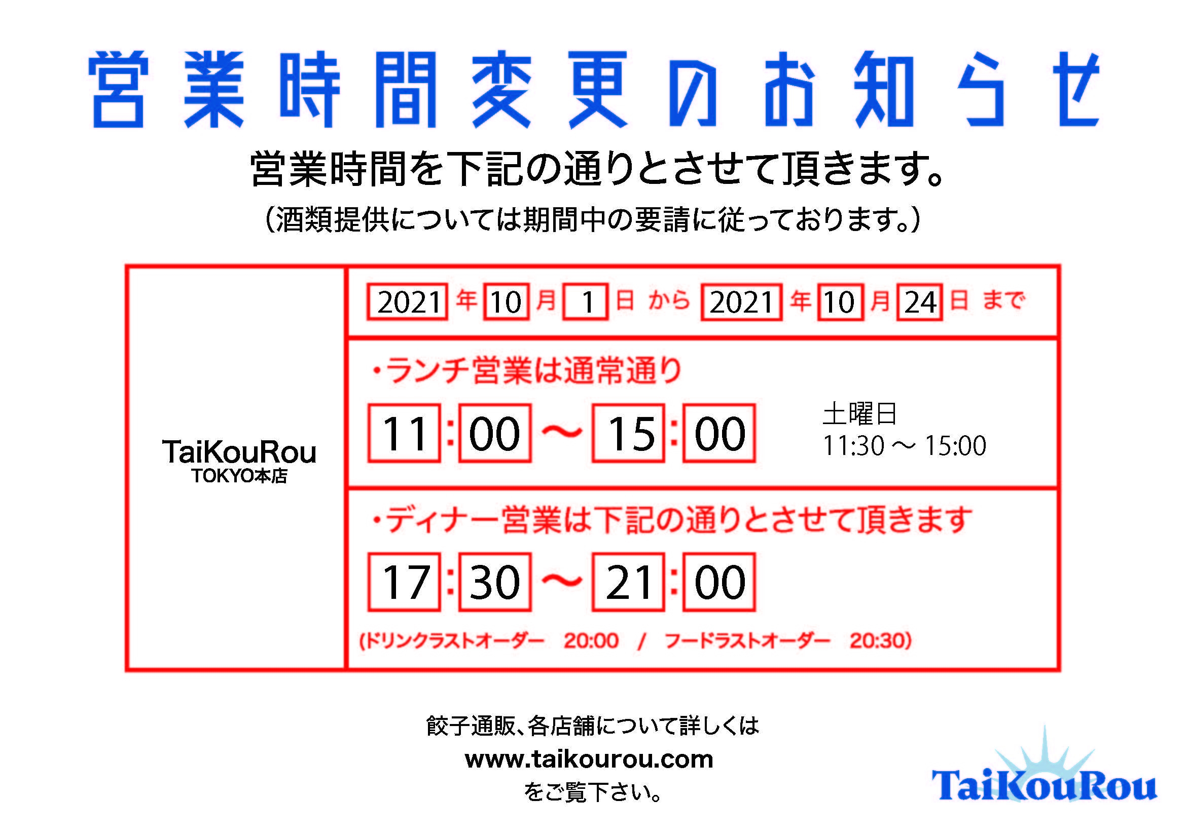 10月1日~10月24日までの営業時間をお知らせいたします。