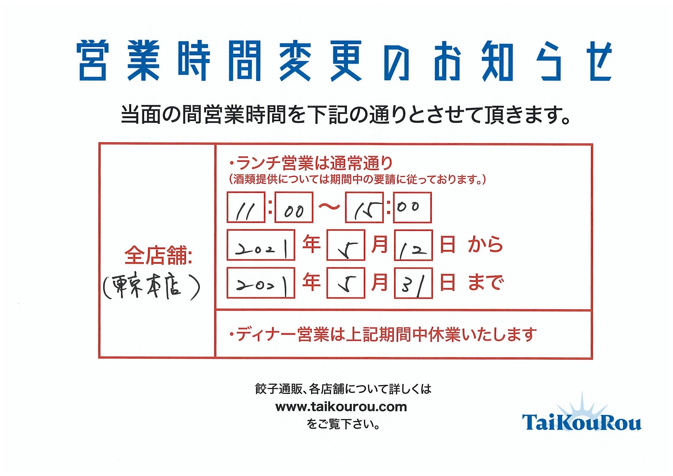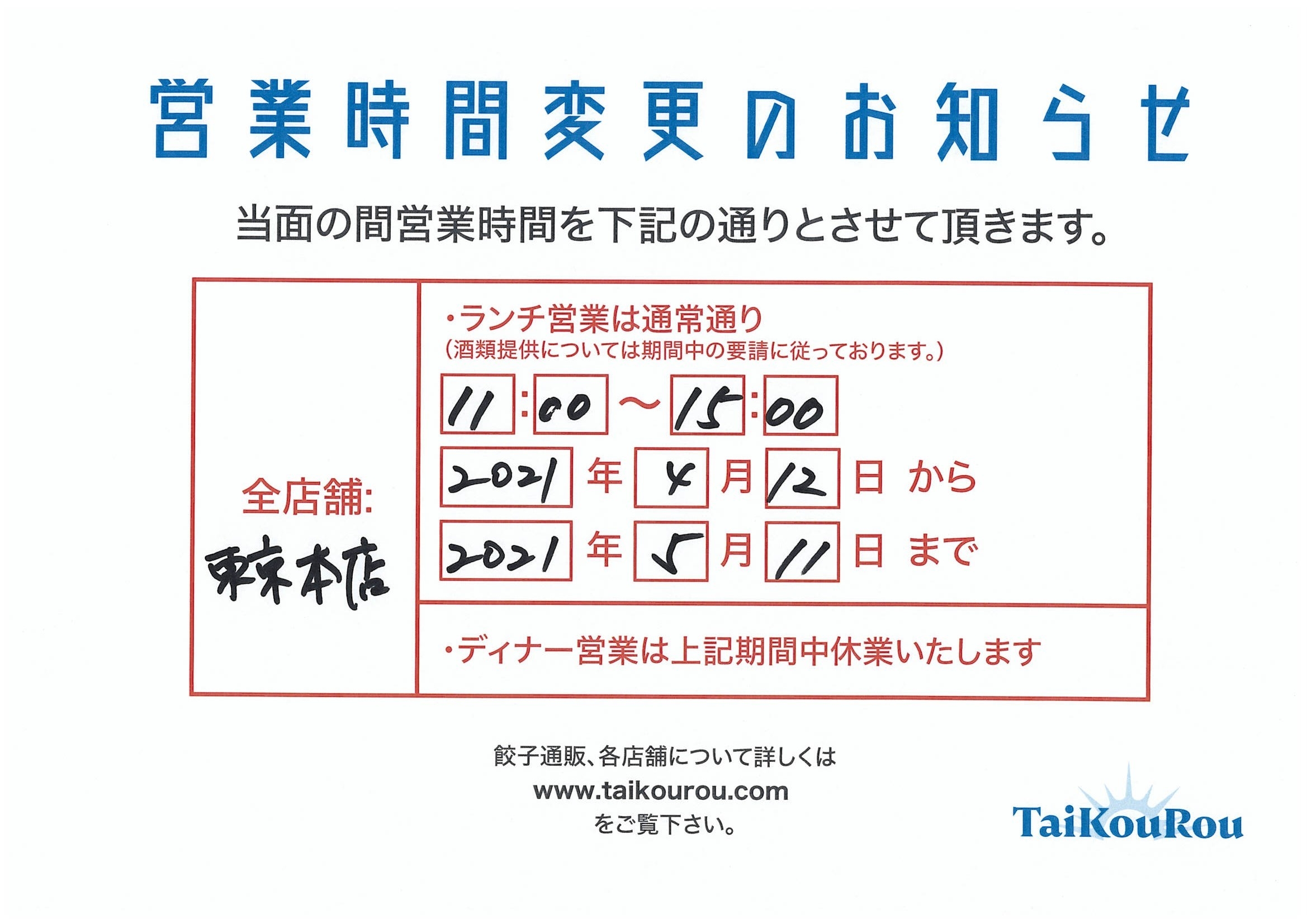 当面の間、左記の通り全店舗ランチ営業のみとさせていただきます。